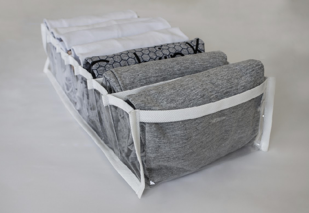 COLMEIA ORGANIZADORA FABRICADA EM PLÁSTICO TRANSPARENTE COM ACABAMENTO EM VIÉS BRANCO DE TNT.